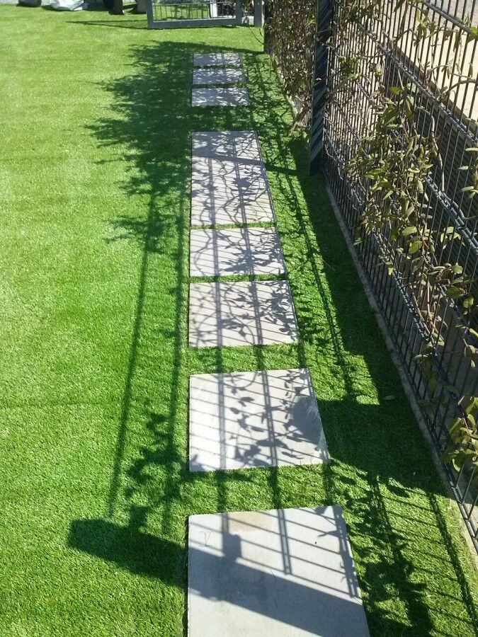 Nach der Winterpause starten wir jetzt wieder regelmäßig mit tollen Bildern von unserem Kunstrasen-Verlegungen bei unseren Kunden. Einen kleinen Vorgeschmack bieten die nachtehenden Bilder von einer kleinen Kunstrasen-Verlegung, bei dem unser Team den Kunstrasen im Garten und ebenso im Vorgarten verlegt hat. Das Ergebnis: Eine perfekte Rasenfläche, die Trittplatten wurden nahtlos integriert und auch bspw. der schmale Streifen an der Hausseite ist von natürlichem Rasen nicht zu unterscheiden.