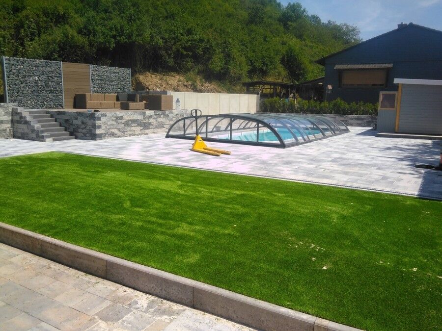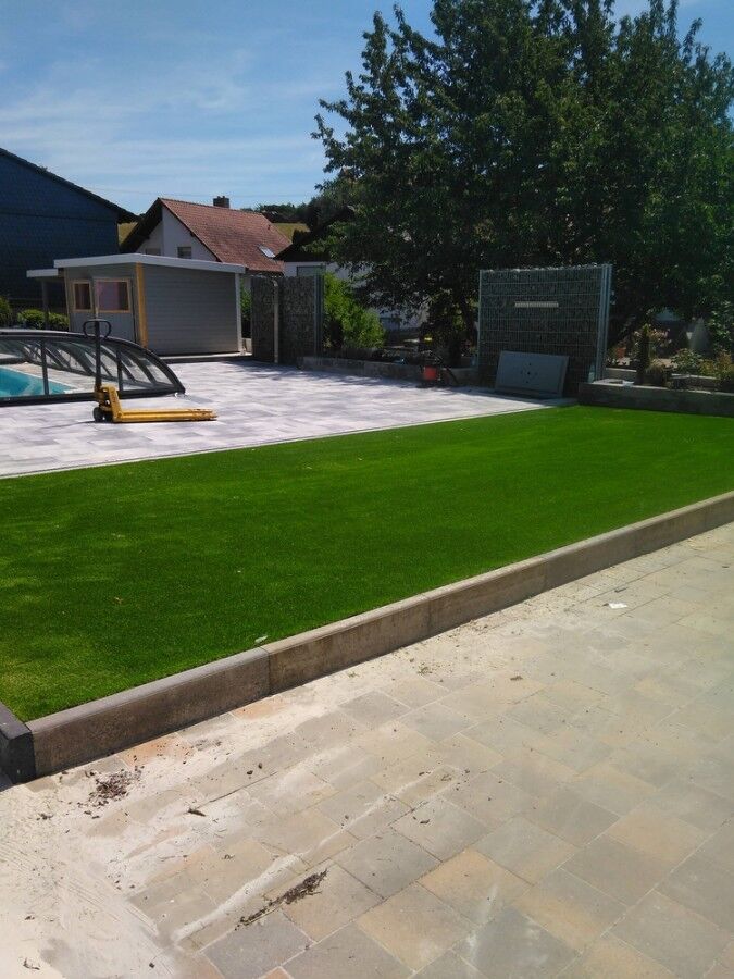 Die heutige Bildergalerie zeigt eine Kunstrasen-Fläche, die wir in einem Privatgarten verlegen durften. Die Kunden hatten sich für die Sorte Kunstrasen Comfort-Line 40MM entschieden, der als Belag für eine Grünfläche neben einem Pool dienen sollten. In Kombination mit der Umgebung hat der Kunde so eine schöne und gleichzeitig besonders pflegeleichte Grünfläche bekommen, die nicht nur intensiv belastbar ist, sondern zudem auch immer wunderbar aussieht.