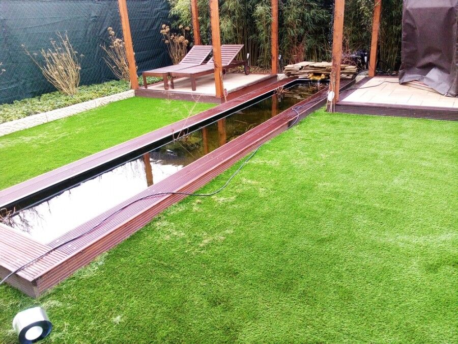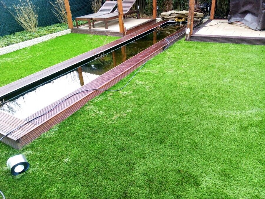 Hier haben wir zwei wunderschöne Bilder von einer Kunstrasen-Verlegung im Garten - ein perfektes Zusammenspiel mit dem Wasserlauf! Überzeugen Sie sich selbst - die folgenden Bilder zeigen unseren Kunstrasen im Garten bei unseren Kunden. Genießen Sie die neuen Bilder von unseren aktuellen Kunstrasen-Verlegungen.