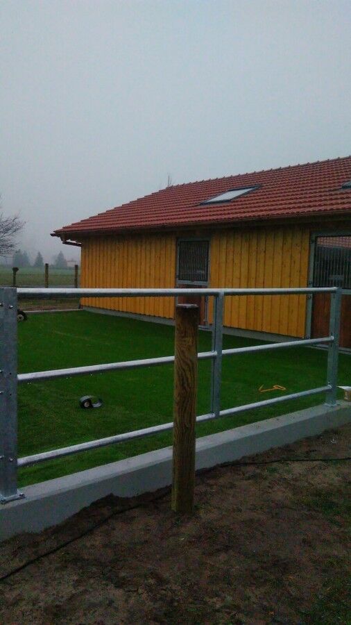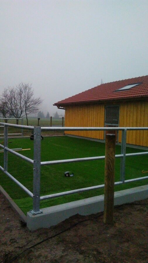 Außerdem haben wir in Halle (Westfalen) unseren speziellen Kunstrasen für Pferdeausläufe - die Sorte Paddock-Line verlegen dürfen. Das Ergebnis: Ein optimaler Auslauf für die Pferde und eine perfekte Optik bei wenig Pflege.