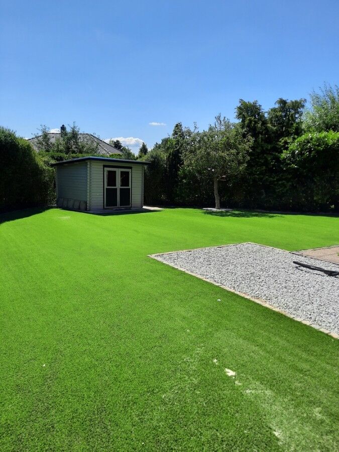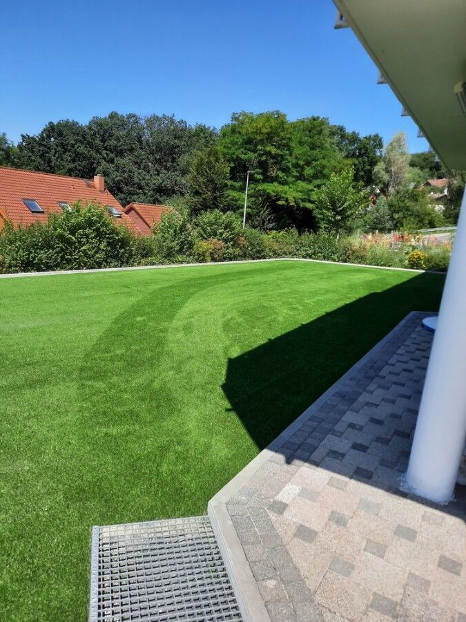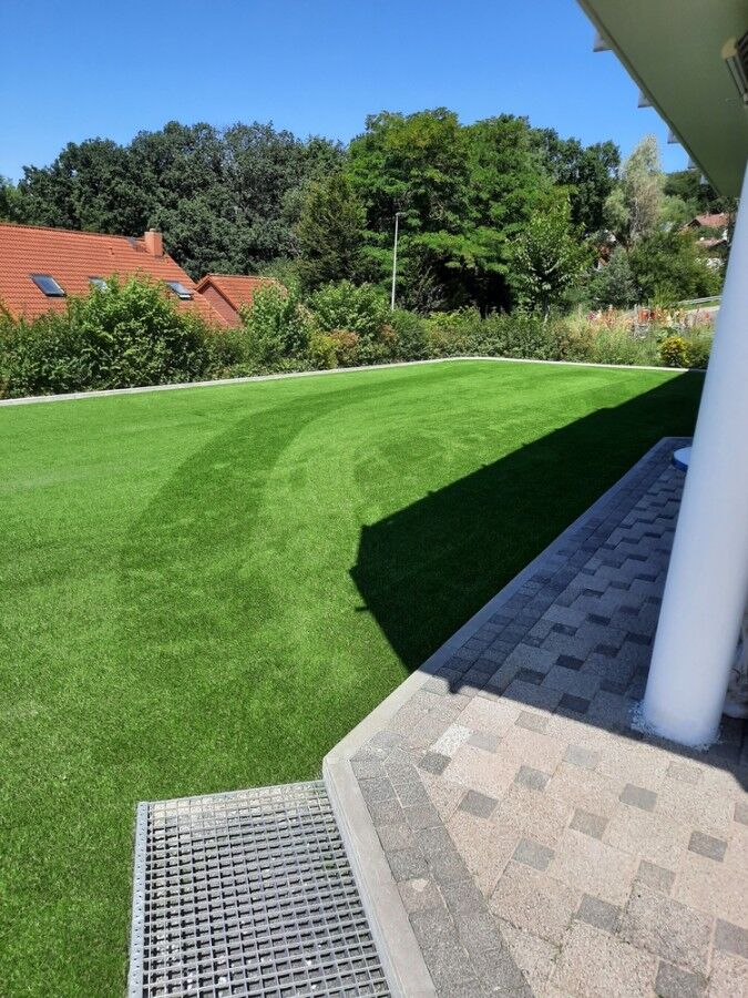 Die Ergebnisse überzeugen - wunderbare und pflegeleichte Grünflächen im Garten, die man von Naturrasen kaum unterscheiden kann.