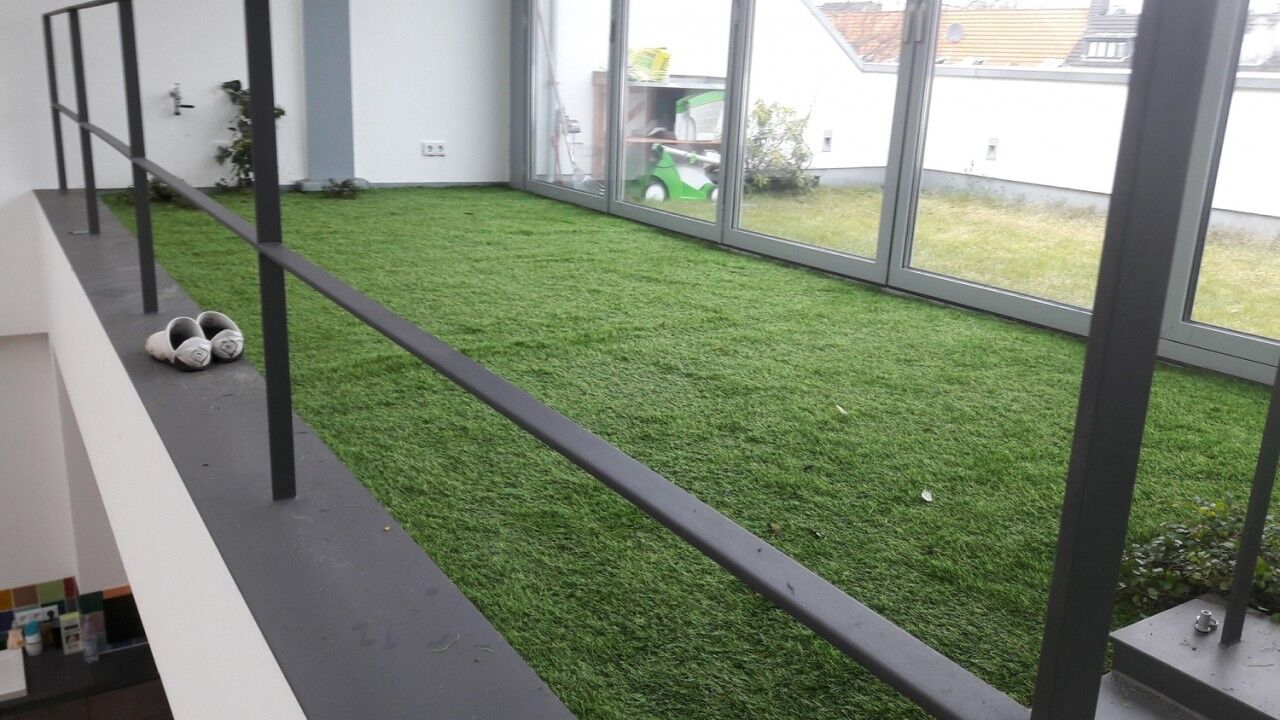 Das heutige Beispiel zeigt, wie sich die Bewohner einer Großstadt-Wohnung mit wenig Aufwand den Traum einer eigenen Grünfläche realisiert haben. Insgesamt 40qm Kunstrasen Comfort Line 50mm wurden im Innenbereich, daran angeschlossen ein Teil, der zur begrünten Dachterrasse geöffnet werden kann. So bekommt man eine kleinen Gartenersatz, den man zu jeder Jahreszeit nutzen kann – im Sommer auf der Dachterrasse, im Winter auf der Kunstrasen-Fläche im Innenraum. Comfort Line 50mm bietet dabei durch die Floorhöhe von 50mm ein besonders angenehmes Laufgefühl und ist vom natürlichen Vorbild kaum zu unterscheiden.