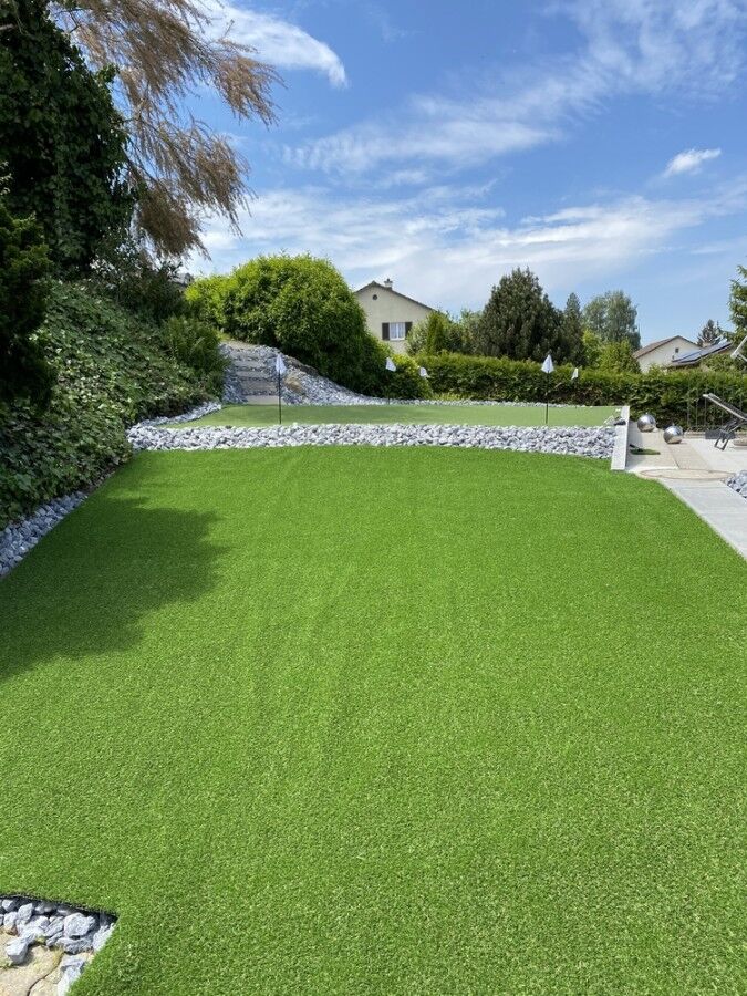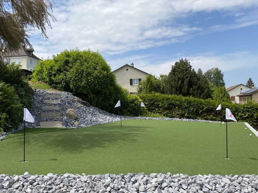 Heute haben wir ein wunderbares Beispiel für einen Kunden aus der Schweiz, der mit dem Kunstrasen Golf Pro 13 mm sein ganz persönliches Putting Green im Garten realisiert hat. Aus einer nur noch eingeschränkt ansehnlichen Rasenfläche wurde eine tolle Anlage mit 5 Löchern, um fleißig am eigenen Handicap arbeiten zu können. "Das Putting-Green ist super von der Geschwindigkeit" bericht der neue Besitzer.