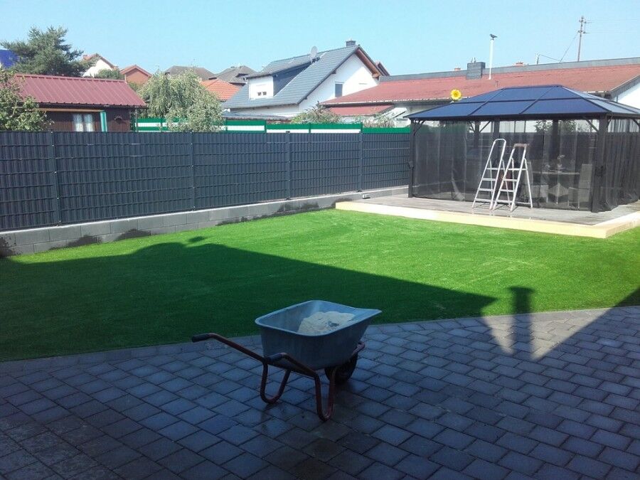 Die heutige Bildergalerie zeigt eine Kunstrasen-Verlegung, bei der wir in einem Privatgarten verschiedene Flächen mit unserem Kunstrasen ausstatten durften. Zum Einsatz kam dabei die Kunstrasen-Sorte Premium-Line 40MM. Auch die Bereiche um den Pool und die Sitzgelegenheit wurden mit Kunstrasen ausgestattet, so dass der Kunde so nun eine schöne und gleichzeitig besonders pflegeleichte Grünfläche bekommt.
